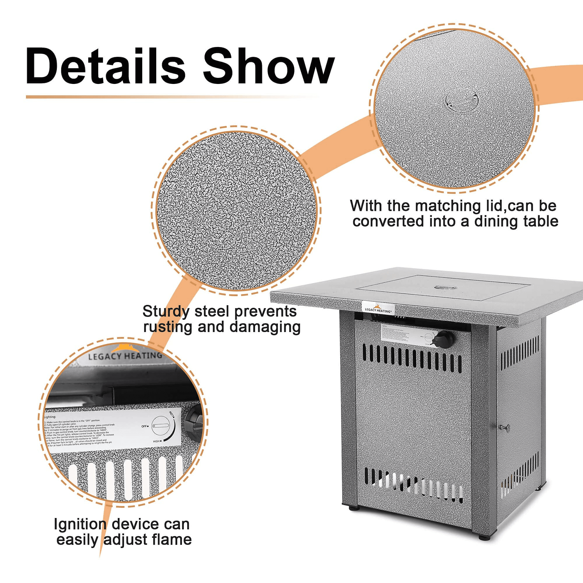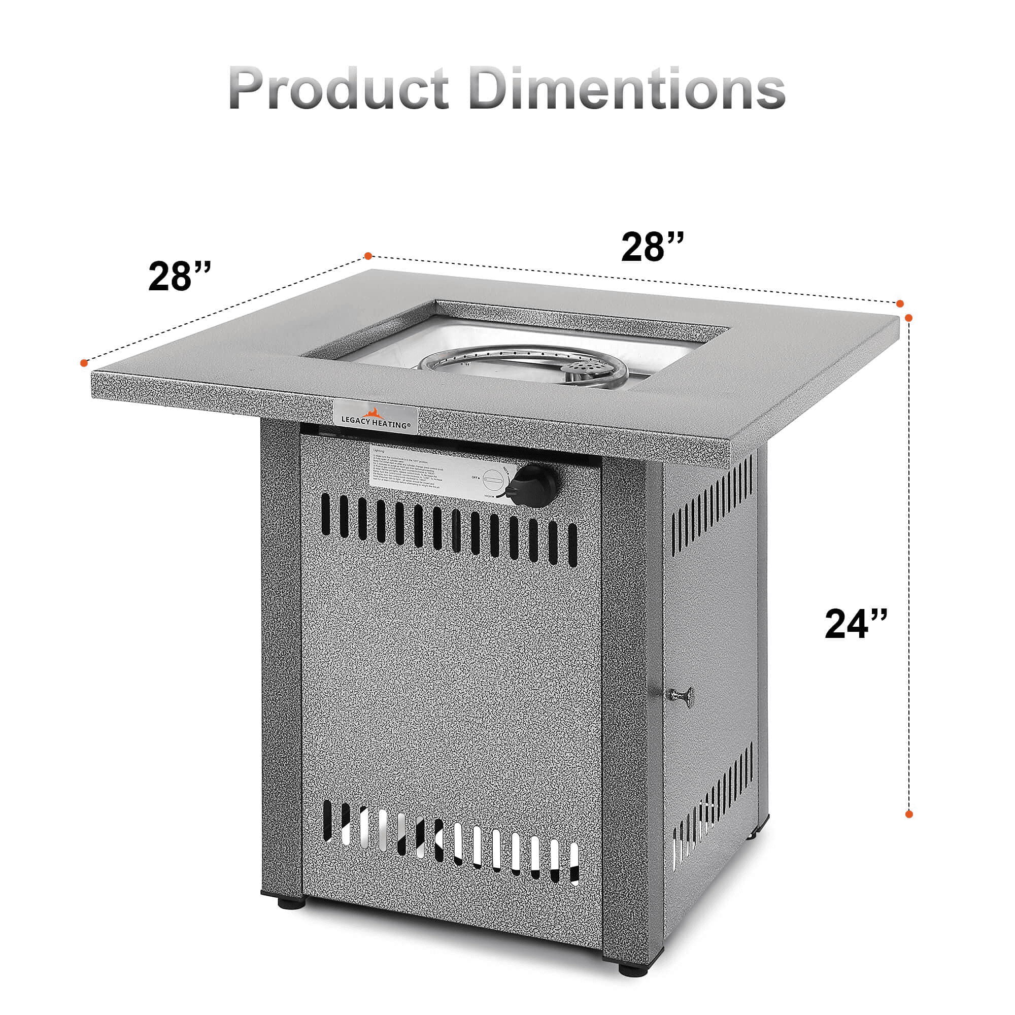 • Ideal for Outdoor Parties - 28 in square fire pit table is the perfect way to update your outdoor space. The unique hammered sliver perfectly matches your outdoor furniture. This gas fire pit is ideal for family and friends gatherings or campfire parties. While it brings you warmth; it can also create a relaxing and romantic atmosphere for you.