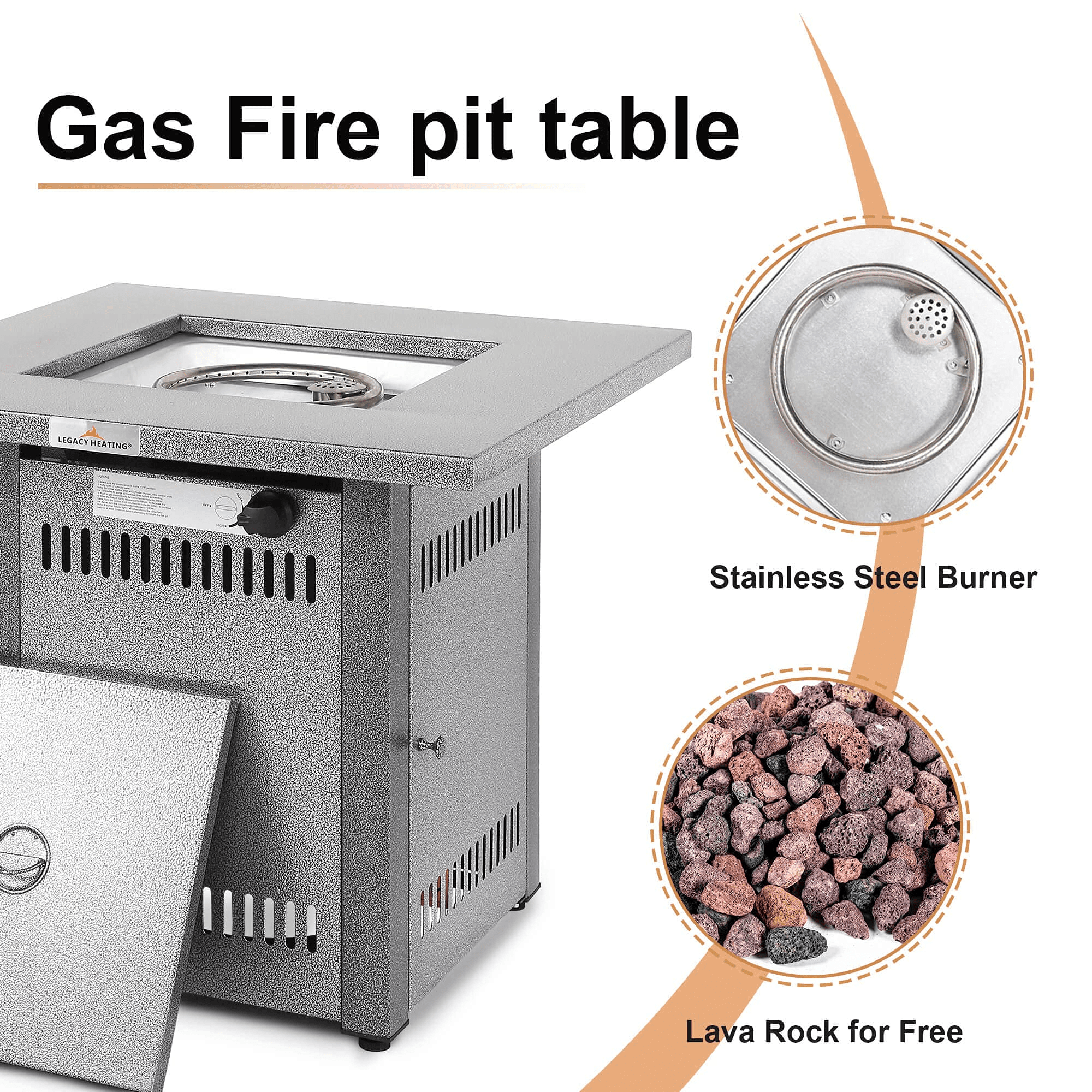 Legacy Heating 50; 000 BTUs Fire table; used as a fire pit; meanwhile also can be applied as a bistro table with the lid added to the fire bowl. Enjoy those nice nights with this square fire pit table that is made from rust-resistant powder-coated iron. This table can be used as a fire pit or as a dining table when you cover the burner area with the included tabletop lid. The commercial-grade stainless steel burner also comes with lava rocks and can provide up to 50; 000 BTUs of heat using just a 20-pound propane tank (not included). To start; press a button and adjust the flame with the control knob from low to high. The convenient door makes it easy to change the tank when needed and hides the tank from view. Stay outdoors longer with this easy to use fire pit table!