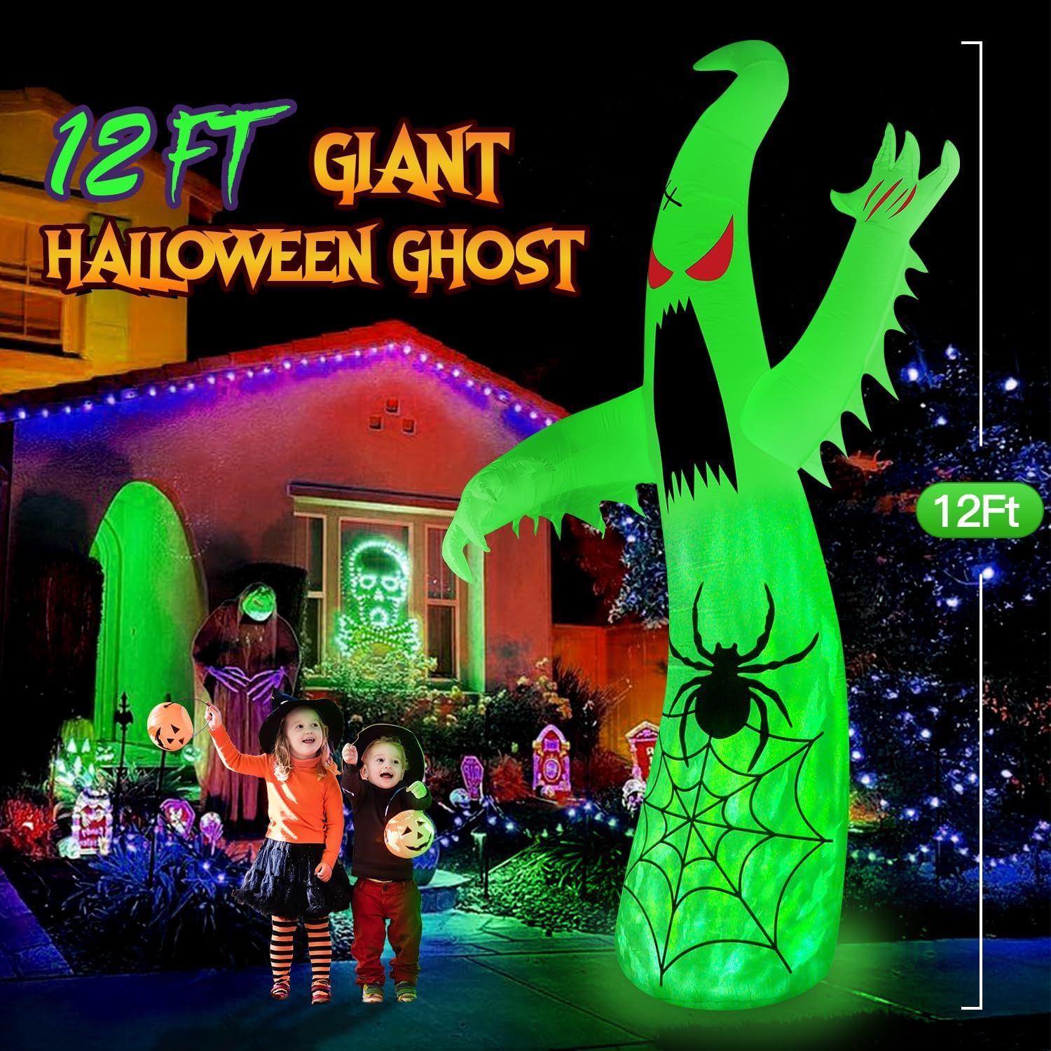 [2024 Upgraded 12 FT Halloween Inflatables with 3-Color Flame Rotating LED]zukakii 12FT Halloween Giant Ghost combined with built-in 3-color flame rotation LED lights, and fully upgrade the air blower power to ensure efficient inflation and standing right up steady, never worry about falling, is a perfect Halloween decoration outdoor to make your yard an unforgettable attraction and adores all ages trick-or-treaters![Spooky Giant Ghost Appearance Creates Fright Halloween Atmosphere]The Halloween blow up yard decorations feature 12FT red-eye towering ghost appearance, raising two paws high as if to pounce forward, the body is covered with spider webs with a big climbing black widow. The built-in bright 3-colored flame rotation LED glowing a flowing flame-like light will light up your yard or front door festively and definitely will be the most eye-catching Halloween decoration among your neighbors[Premium Material with Outstanding Craftsmanship]zukakii Halloween decorations outdoor inflatable adopt high-strength tear-resistant waterproof polyester and are 100% hand-sewn by skilled workers, perfect for outdoor Halloween decorations. Equipped with a powerful blower and UL-certified plug, just put the plug in and the Halloween yard inflatables ghost will blow up to full within 1 minute automatically[Additional Fittings for Easy & Stable Installation]The 6.6FT power cord of the blower helps you place the Halloween inflatables ghost anywhere in your home yard garden. The attached 4 stakes, 4 ropes and a sandbag can fix the Halloween inflatables outdoor decoration on the ground and keep it standing right up firmly, and the upgraded powerful fan will blow enough air, never worry about breeze blowing it down. Zip up the bottom zipper to avoid air leakage, and open for fast deflation[Perfect Halloween Gifts for the Fright Night]zukakii outdoor Halloween decoration is sure to attract both adults and kids, perfect Halloween gifts for Halloween night events, Halloween Costume Party, Haunted House Decor, and More. If any problem, please contact us for 24/7 help