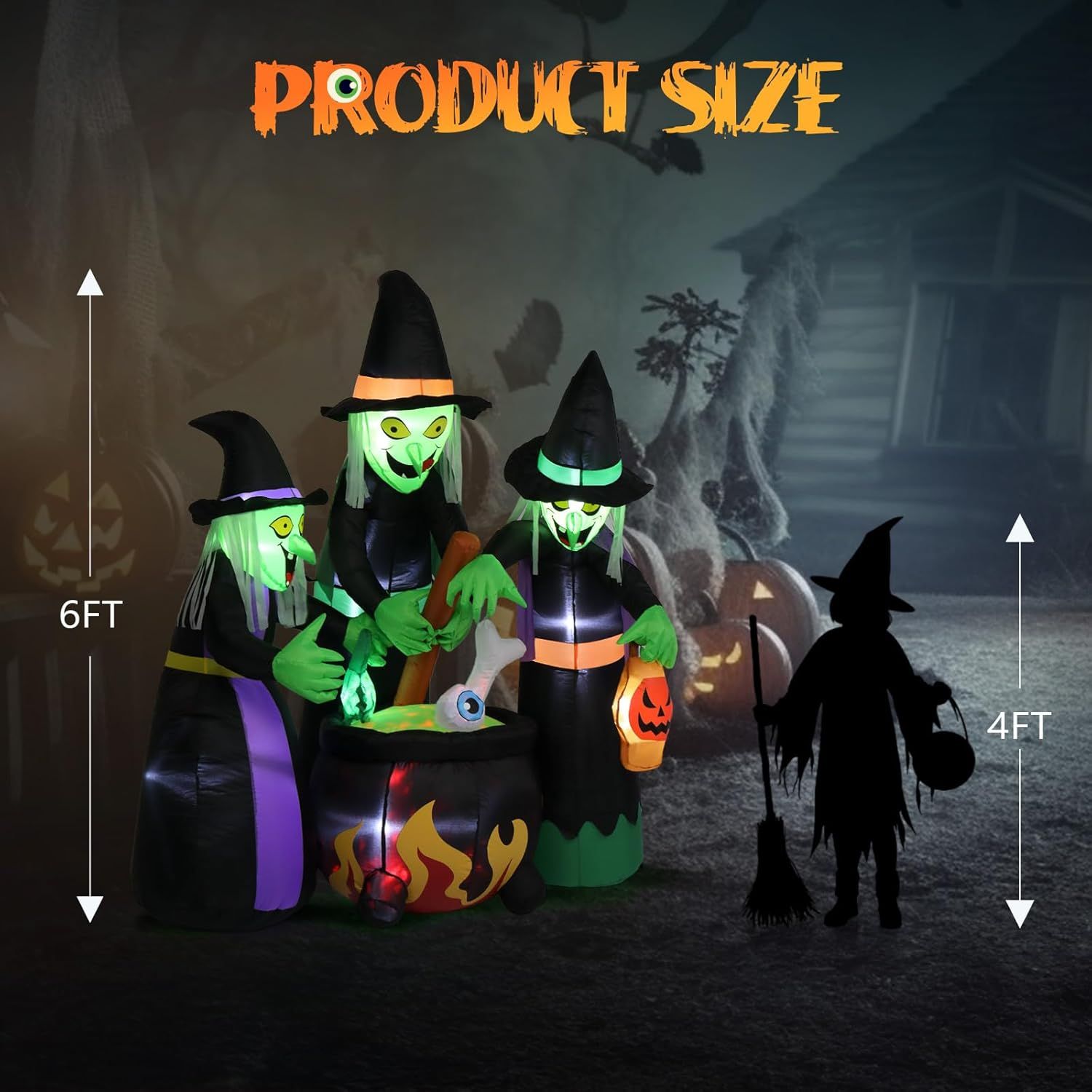 [SPOOKY Appearance Design]Our inflatable witches decoration is 3.2 ft long, 2.9ft wide, and 5.9 ft high. The cute Halloween decoration will also appeal to kids. This childlike décor is perfect for your friends as a gift. This gift will bring you joy and is ideal for your Halloween display.[Easy to Set up]All you need to do is close the zipper at the bottom and plug it in, the auto-inflatable will inflate in just a few seconds for convenience. The scary outdoor inflatable has bright built-in LED lights that look great at night and illuminate neighbors and guests nicely to attract them.[Durable and Stay up Easily] Our blow up light garden decoration is made of high quality fabric, lightweight and durable, easy to store after deflated and can be reused many times. The Halloween inflatable lawn decoration is equipped with ground stakes and ties to keep the tree in a stable condition. Our LED lighted home decor looks so pretty when it is inflated, and it will stay up. Keeping in high spirits, be perfect for indoor and outdoor use.[Widely Used]Our LED light-up decoration is perfect for Halloween patio decorations. The holiday inflatable can also be used as stage props , make your home patio extra scary, attract customers to your store.[Customer Service] We Offer You Best Customer Service, If You Have Any Questions, Please Feel Free to reach out. Our service team would provide 24-hour premium service to help solve any of the problems. Hope you have a great shopping experience.