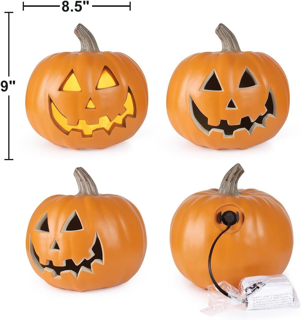 ULTRA-SAFE PRELIT PUMPKIN- This Halloween jack-o-lantern uses premium PP material and LED lights instead of real pumpkins and candles, flameless, non-toxic, and odor-free. Each pumpkin is equipped with UL and ETL-listed cords, LED bulbs, and 2 ultra-safe fuses, light up pumpkins are the perfect addition to indoor and outdoor decor.OUTDOOR & INDOOR DECORATIONS - The Halloween lanterns with PP shells and ETL-listed cord and bulbs that are waterproof, allow for both indoor & outdoor use. The bottom hole helps drain water out when it rains. Easy to clean and carry.DURABLE QUALITY & SHATTERPROOF - These fake artificial lighted pumpkins are made of high-quality PP material that features safe, environmentally, and shatterproof. It's reusable year after year. Besides, this Halloween pumpkin is lightweight and easy to move, allowing you to easily change the placement of the jack-o-lantern to decorate different areas of your home or yard.VARIOUS PUMPKIN SIZES & PATTERN- There are various sizes of pumpkins for your options, like 6/10/11/12/13/14/ 15/16/20/21 inches, with different faces. The spooky, or scary face for adding more atmosphere to Halloween. The smiling face is for Happy Halloween decorations if you don't want to scare the kids. Different sizes meet your different needs for Halloween decorations ideas, a mantle or front porch are both great. It will be a big hit at your Halloween party!REALISTIC PUMPKIN - Our pumpkin lantern is designed with a unique style, coated with long-lasting orange color, making the jack-o-lantern like a real pumpkin. It stands through sunshine and rain, as vivid as always, and will not fade.